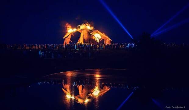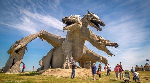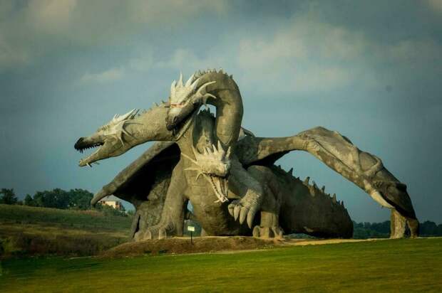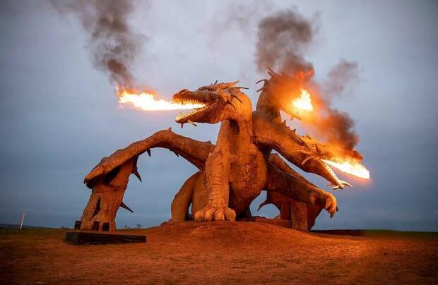Это работа скульптора Владимира Колесникова, и она по-настоящему впечатляет. В высоту фигура трехглавого дракона около 15 метров, примерно таких размеров и был мифический змей. Грозный монстр с тремя головами периодически кричит и действительно дышит огнем.Скульптуру начали строить в 2015 году и работали над ней два года. Змей действительно имеет сходство со сказочным персонажем: он возвышается на холме и словно следит с высоты за всем парком. Еще до того, как фигура сказочного злодея была закончена, его фотографии разлетелись по соцсетям, привлекая в парк гостей. Сегодня на «Кудыкину гору» приезжают сотни туристов, чтобы увидеть монстра своими глазами.